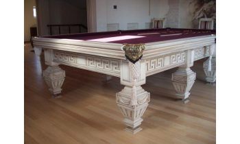 Эксклюзивный бильярдный стол Греческий – настоящая инновация нашего времени. Корпус изготовлен из натуральной окрашенной в белый цвет древесины, которая идеально сочетается с насыщенно бордовым полем. Греческие золотистые орнаменты придают белому корпусу большей элегантности и изысканности. Это стол из лучшей коллекционной линейки современности. Лузы выполнены из массивных вставок золотистого металла. Форма ножек изготовлена в виде греческих колонн, на что просто невозможно не обратить внимание. Высокопрочная устойчивая конструкция элитного бильярдного стола позволяет играть в бильярд сколько угодно.